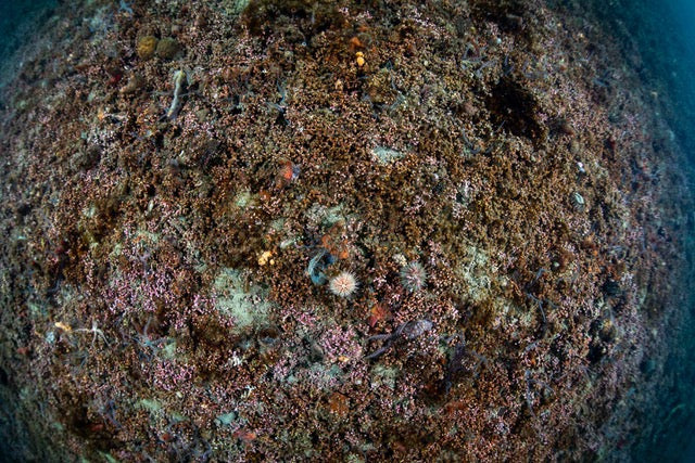 p.094, Vue d’ensemble d’un banc de maërl, on peut y apercevoir de nombreuses espèces associées. Rade de Brest – Finistère.