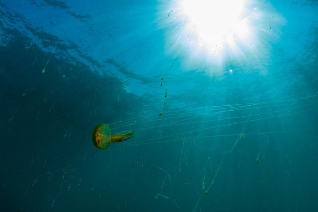 p.121, Méduse pélagie, Pelagia noctiluca, évoluant dans une eau chargée d’agrégats de plancton et de bactéries. Mer d’Iroise – Finistère.