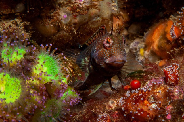p.133, Blennie, Parablennius gattorugine, aux aguets sur une paroi recouverte d’anémones-bijoux, Corynactis viridis. Cap Fréhel – Côtes d’Armor.