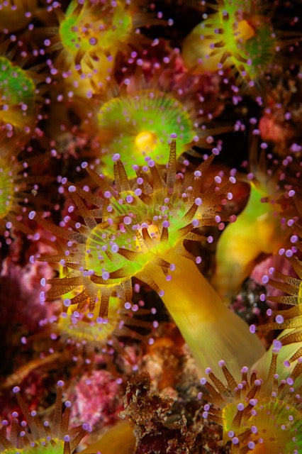 p.135, Anémones-perles ou anémones-bijoux, Corynactis viridis. La coloration souvent vive est très variable : verte, violette, rouge, orange, rose, jaune, blanchâtre ou brune. Belle-Île-en-Mer – Morbihan.