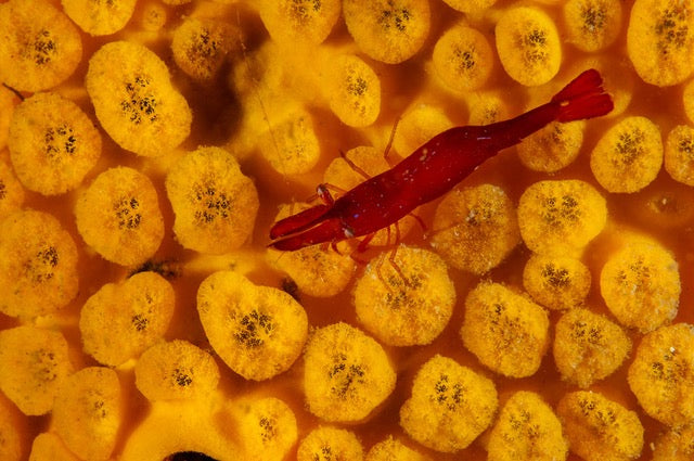 p.139, Crevette hyppolyte, Hippolyte varians, évoluant sur une éponge clione, Cliona celata. Île d’Hoëdic – Morbihan.